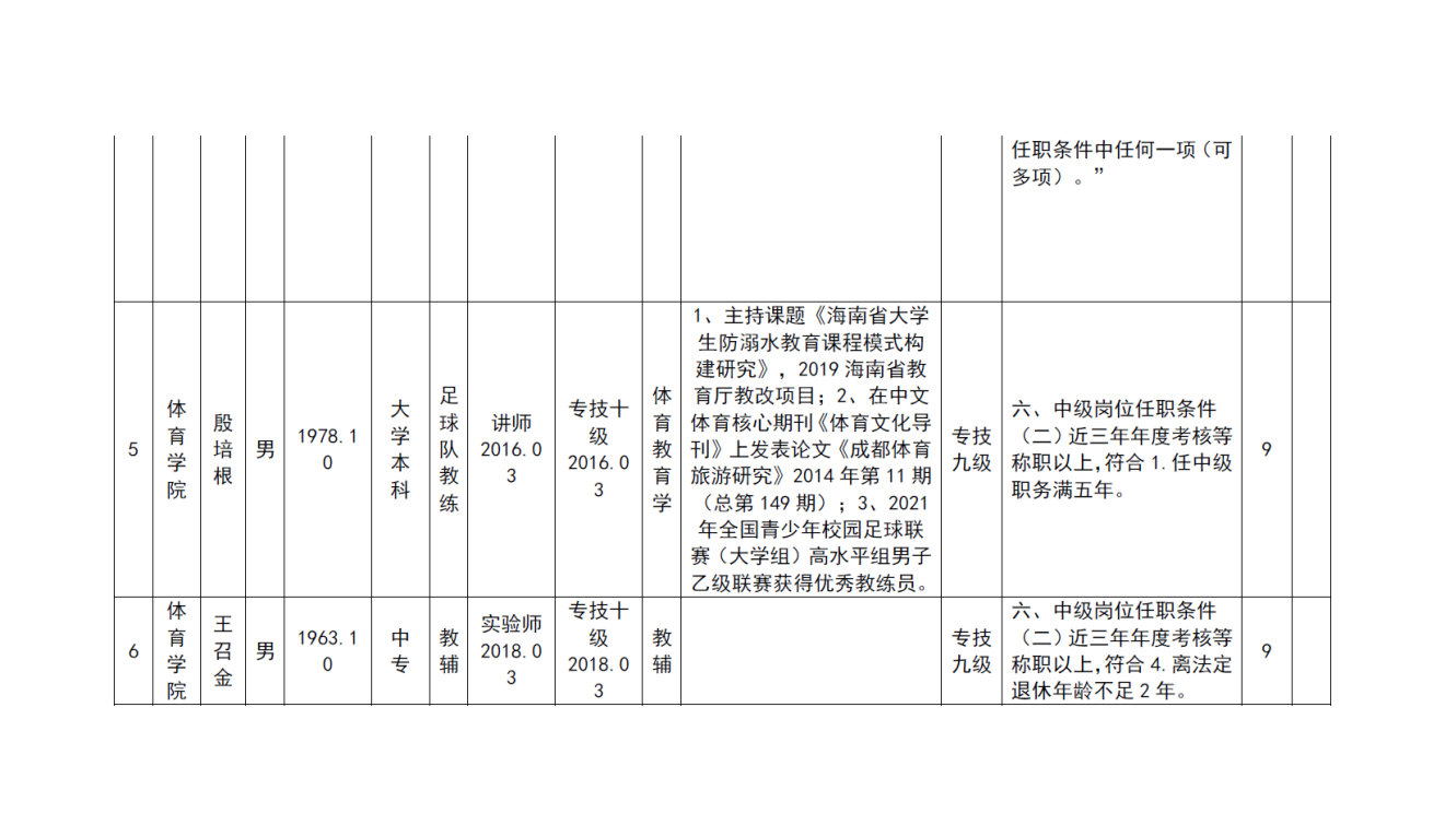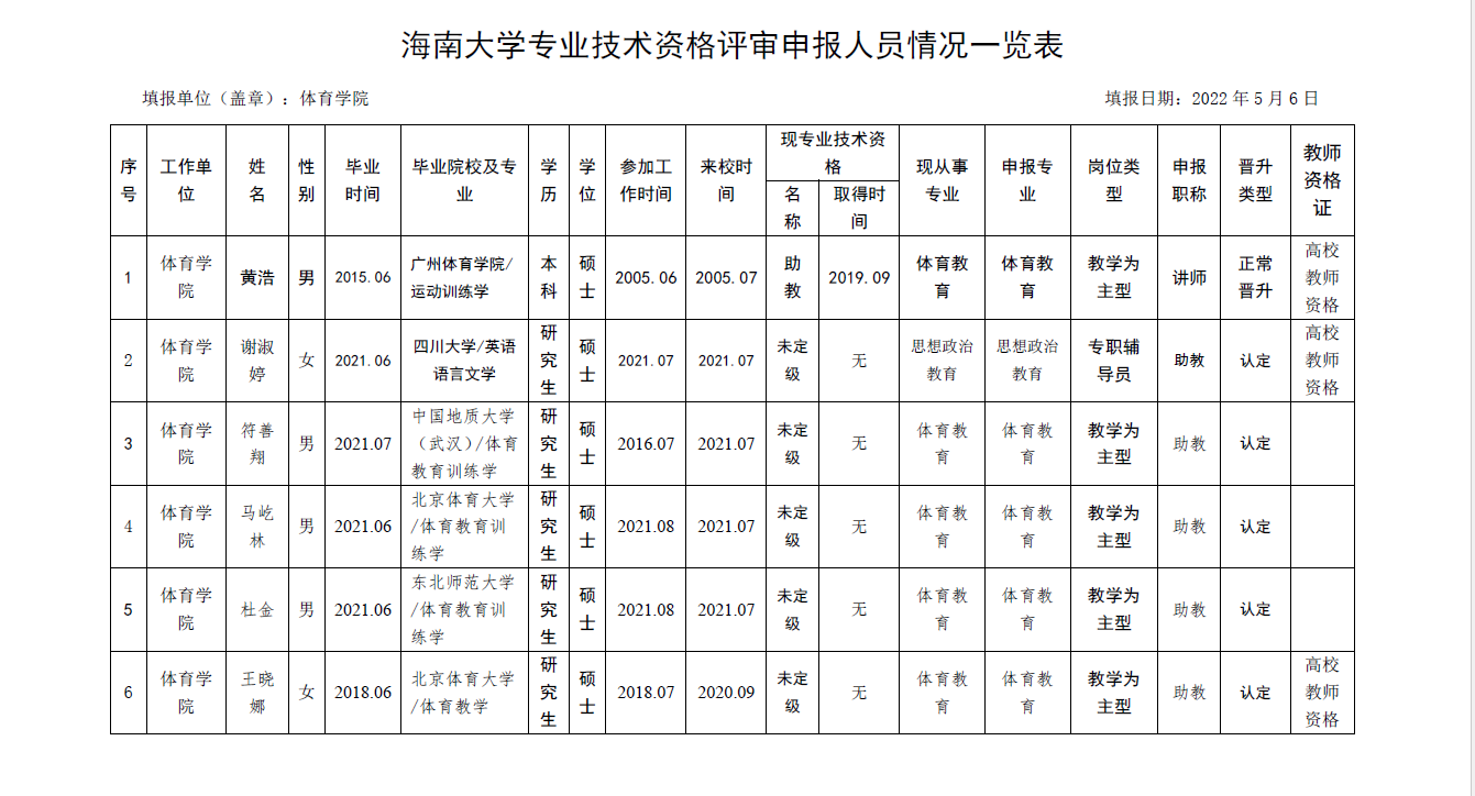 根据《海南省人力资源和社会保障厅关于我省事业单位岗位设置管理有关问题的通知》(琼人社发[2013]54号),《williamhill官网网站岗位设置及聘用方案(修订)》(海大[2020]103号)等相关要求,由教职工本人申请,共有6名教师提出2022年度专业岗位聘用申请、10名教师提出专业技术评审和认定申请, 公司基层评审委员会审核,并票决全部通过。具体名单如下: